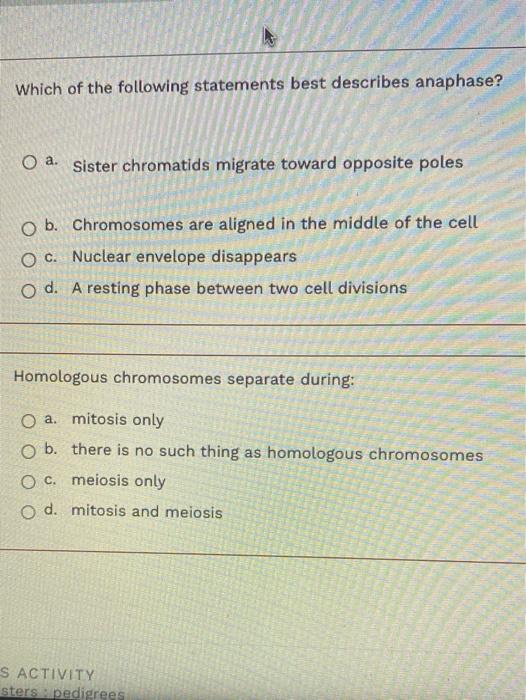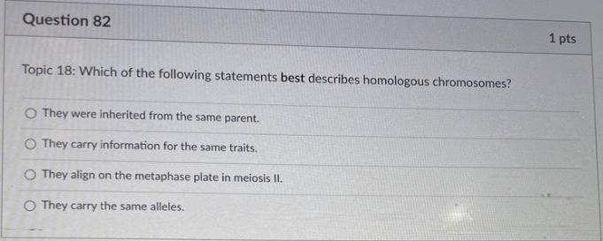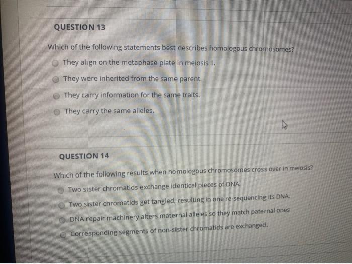 Which of the following statements best describes homologous chromosomes. Chromatids on different members of a homologous chromosome pair. Which of the following statements best describes the major difference between metaphase 1 of meiosis and metaphase of mitosis.